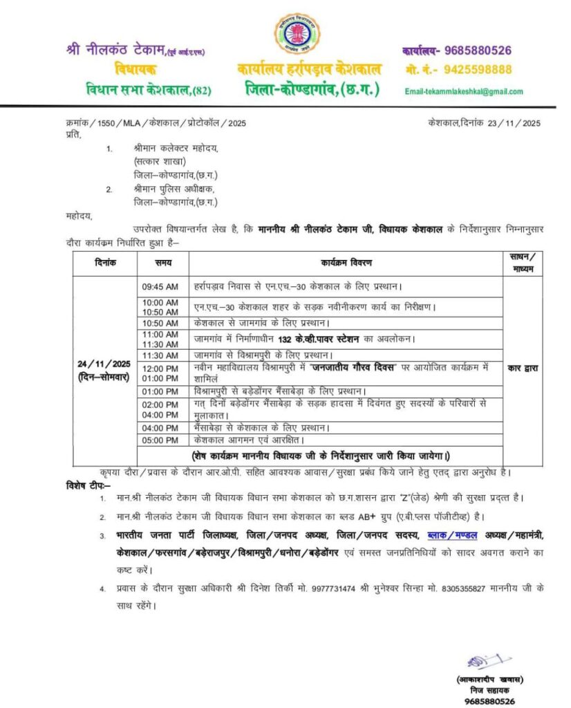 केशकाल /सुमन गावड़े–केशकाल विधायक नीलकंठ टेकाम कल सोमवार सुबह 10बजे केशकाल की जर्जर सड़क नवीनीकरण कार्य का करेंगे निरीक्षण पिछले कई महीनो से केशकाल सड़क के नवीनीकरण की मांग के बाद केशकाल विधायक ने सड़क नवीनीकरण हेतु कार्य स्वीकृत करवाया था, जिसके बाद अब सोमवार से कार्य शुरू होना है विधायक केशकाल नीलकंठ टेकाम उक्त नवीनीकरण कार्य का निरीक्षण करने के पश्चात जमगांव में हो रहे 132 केवी सब स्टेशन निर्माण की प्रगति देखने के पश्चात विश्रामपुरी में महाविद्यालय में अनुसूचित जनजातीय गौरव दिवस के उपलक्ष्य में होने वाले कार्यक्रम में शिरकत के पश्चात बड़ेडोंगर के भैंसबेड़ा में पांच नवयुवकों की सड़क दुर्घटना में मृत्यु हो गई थी जिनके परिवारों से मुलाकात कर सांत्वना प्रगट करेंगे।